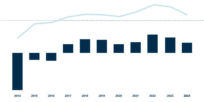 | Margine ante imposte | -5,4% | -0,1% | 0,3% | 2,7% | 4,0% | 3,4% | 2,1% | 3,6% | 4,6% | 4,5% | 3,0% |